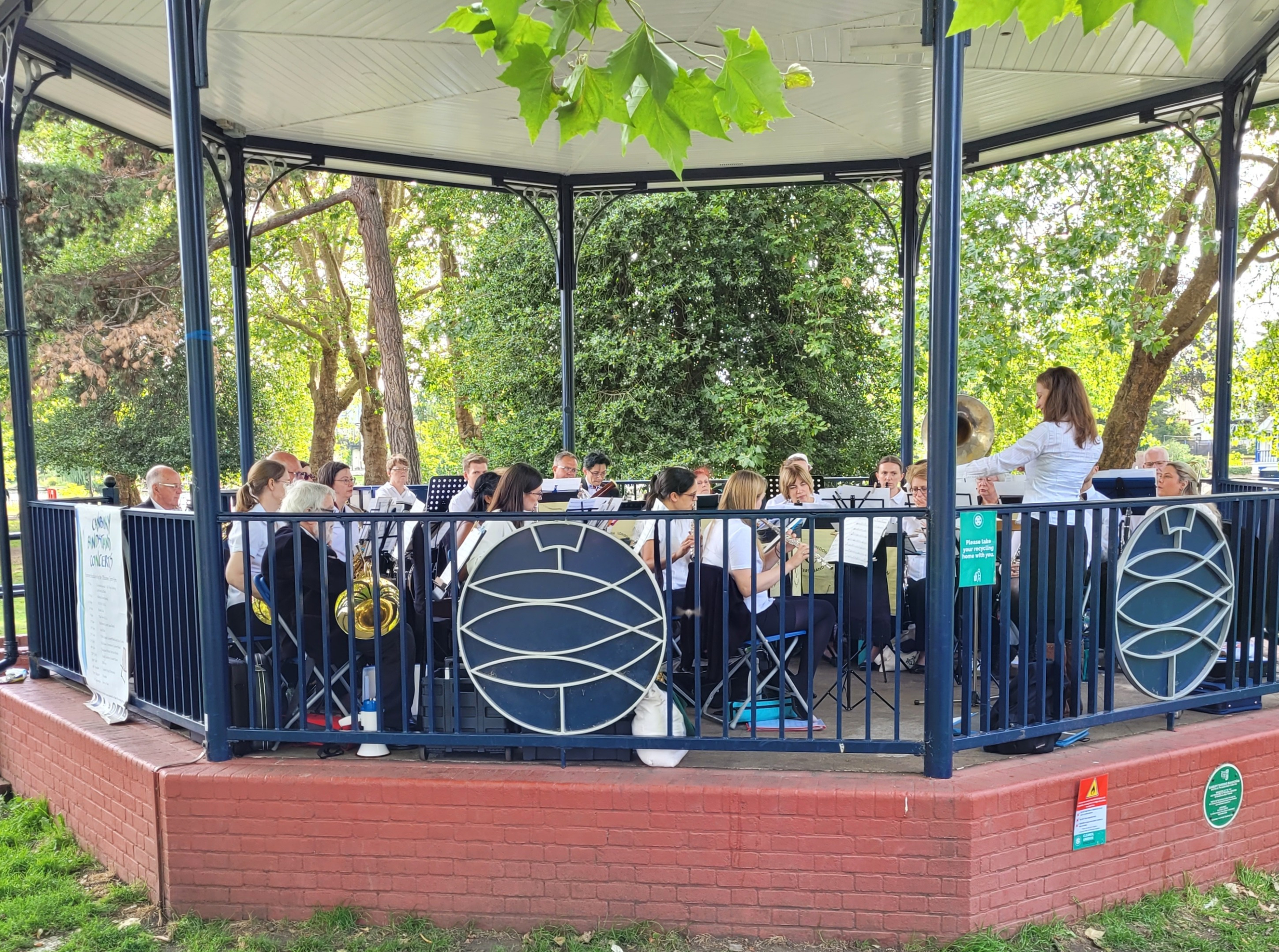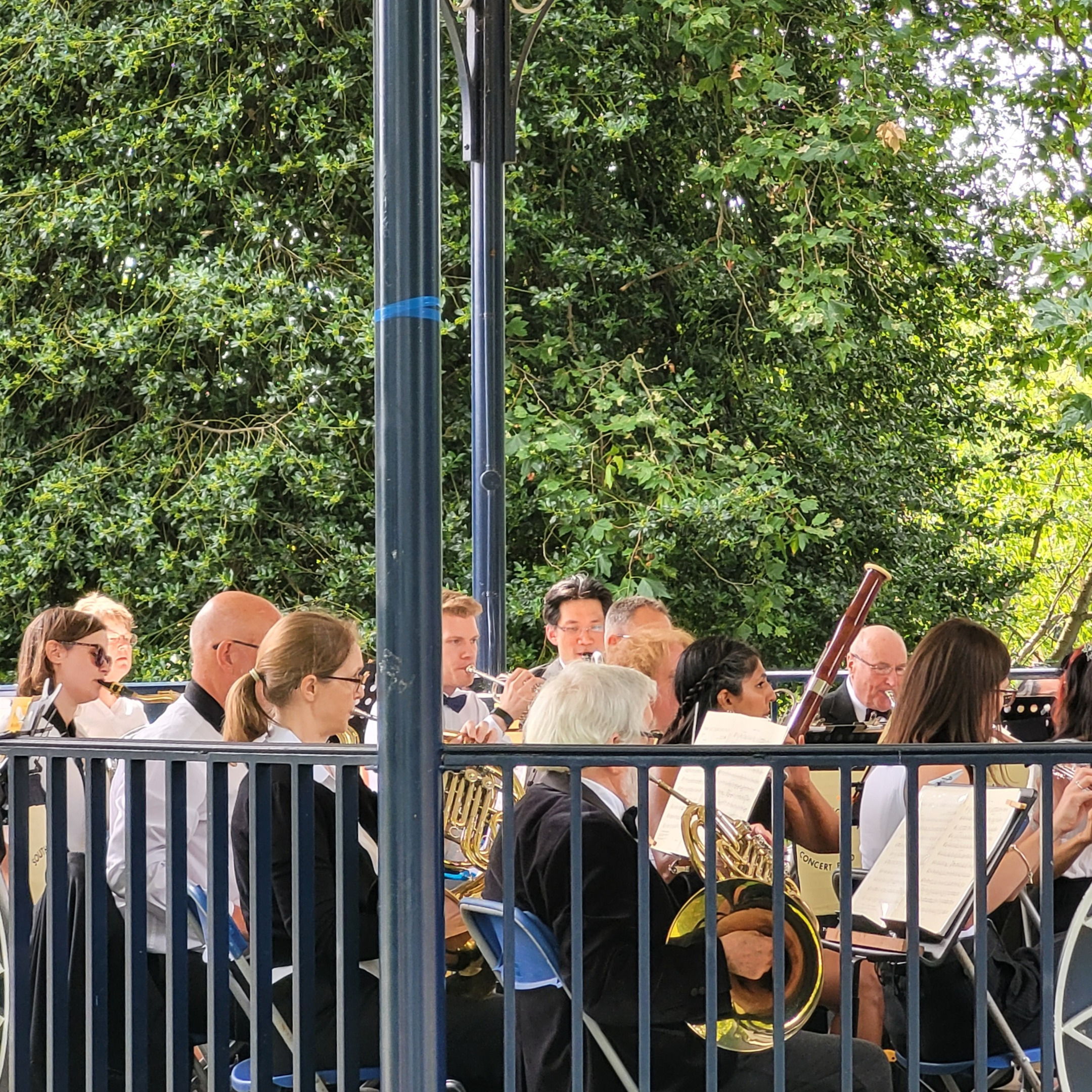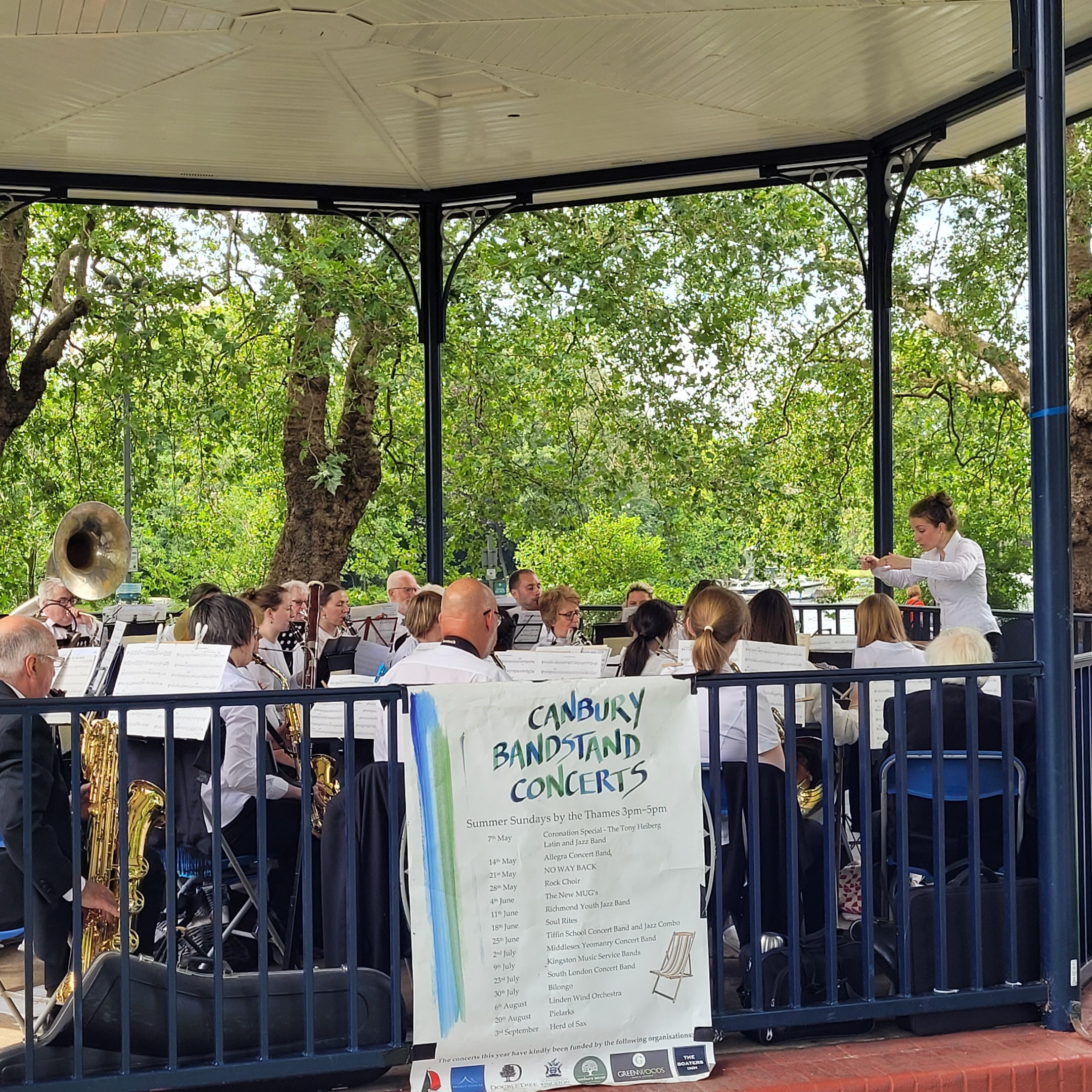 We were delighted to be invited to play at the Canbury Gardens bandstand on Sunday 23 July as part of its Sunday Summers by the Thames. Despite poor weather being forecasted, the sun shone and there was a sizeable crowd as we played a varied repertoire, including Fiddler on the Roof, Lady Gaga Dance Mix and Pomp and Circumstance No. 4.